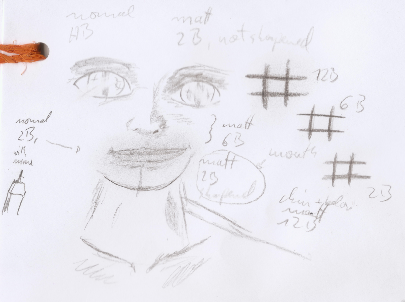The left eye is with a normal HB pencil, the right eye with a 2B matte (but not sharpened …), the left part of the mouth with a 2B mechanical pencil (0.5), the right part of the mouth with a 2B matte pencil (but sharpened), the whole nose is with 6B, the chin and below is with 12B matte.