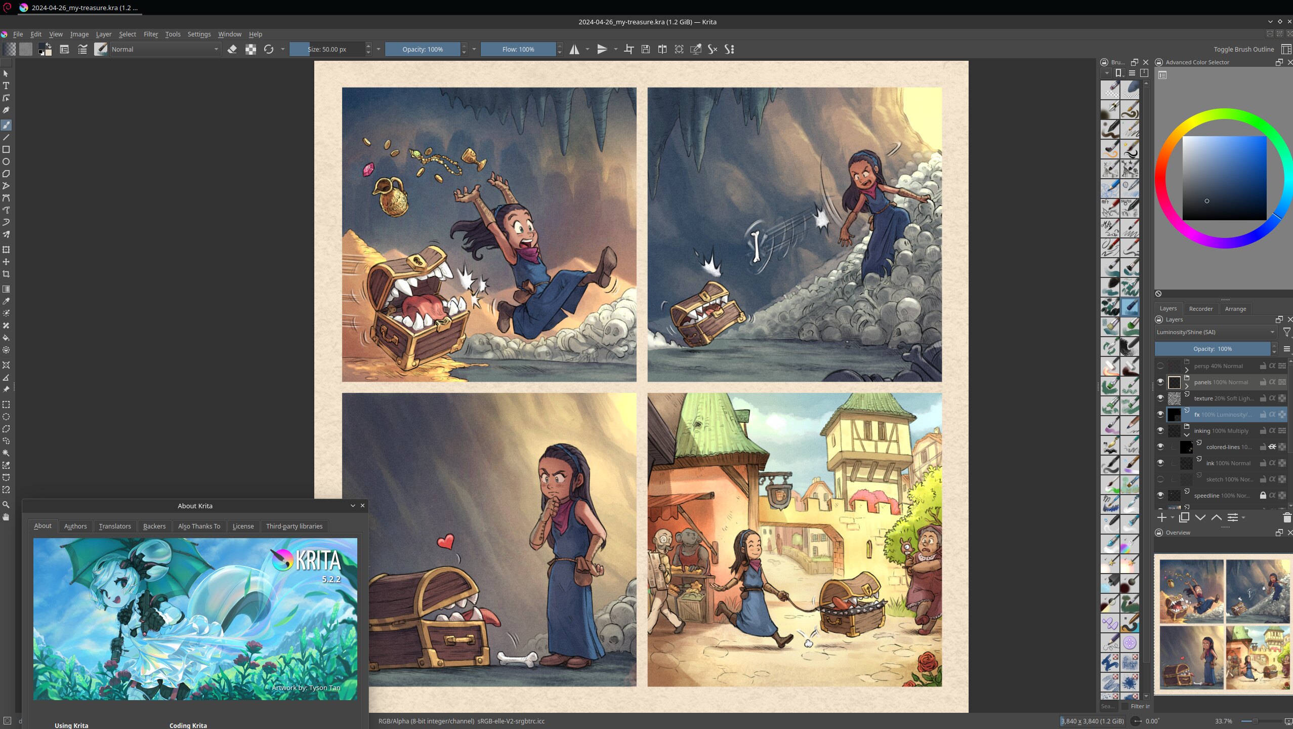 I also like how the GUI allows to reduce the picture as a small size, to see the overall, and how it can open Krita files too.