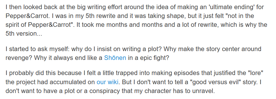 I then looked back at the big writing effort around the idea of making an 'ultimate ending' for Pepper&Carrot. I was in my 5th rewrite and it was taking shape, but it just felt "not in the spirit of Pepper&Carrot". It took me months and months and a lot of rewrite, which is why the 5th version...