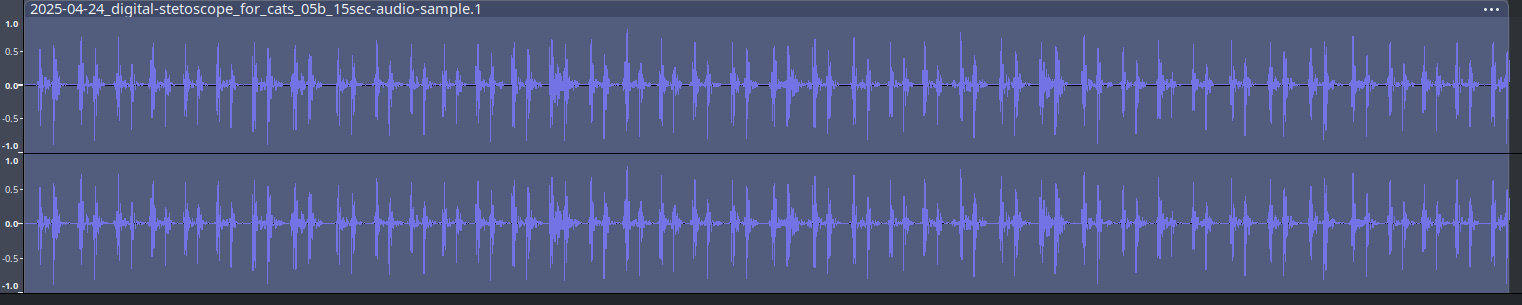 And with that setup, I was able to record my cat's heartbeat using Audacity on my Debian KDE machine. Of course, getting my cat to cooperate was a challenge. At first, all I got was a lot of loud purring that masked the heartbeat sound. But I was patient, and after a few minutes he fell asleep and I managed to get a clean recording.