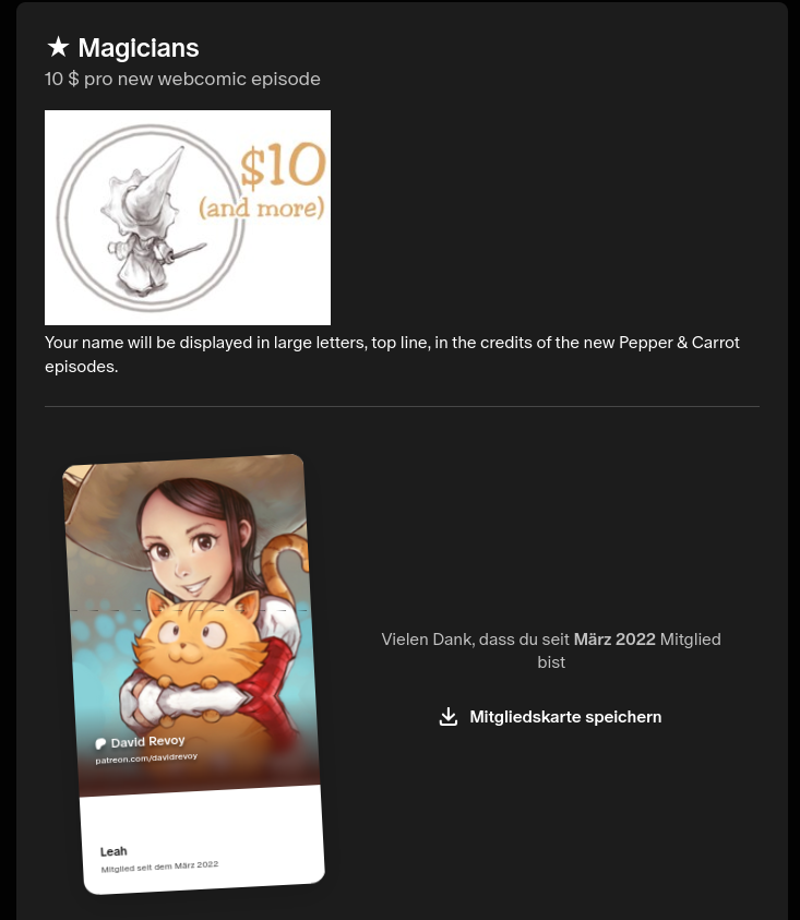 A: Yes, I've updated the tiers to a classic structure: $1, $3, $5, and $10 (and above). I've also added $50 and $150 tiers for companies that want to support my work. The same tiers are available on Tipeee, but in Euros. Since I don't have a paywall, tiers are mainly a way to give my supporters a larger font size in the credits at the end of new Pepper&Carrot episodes.