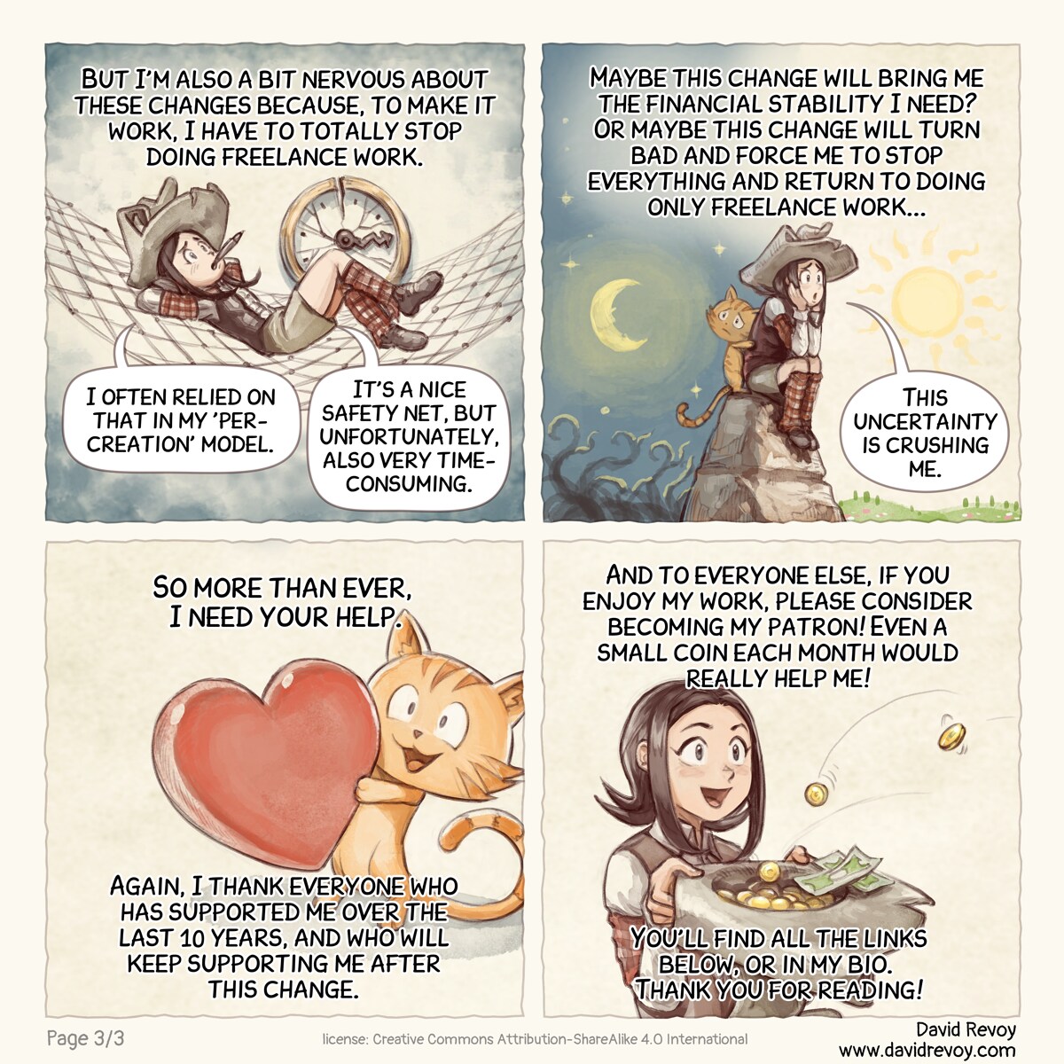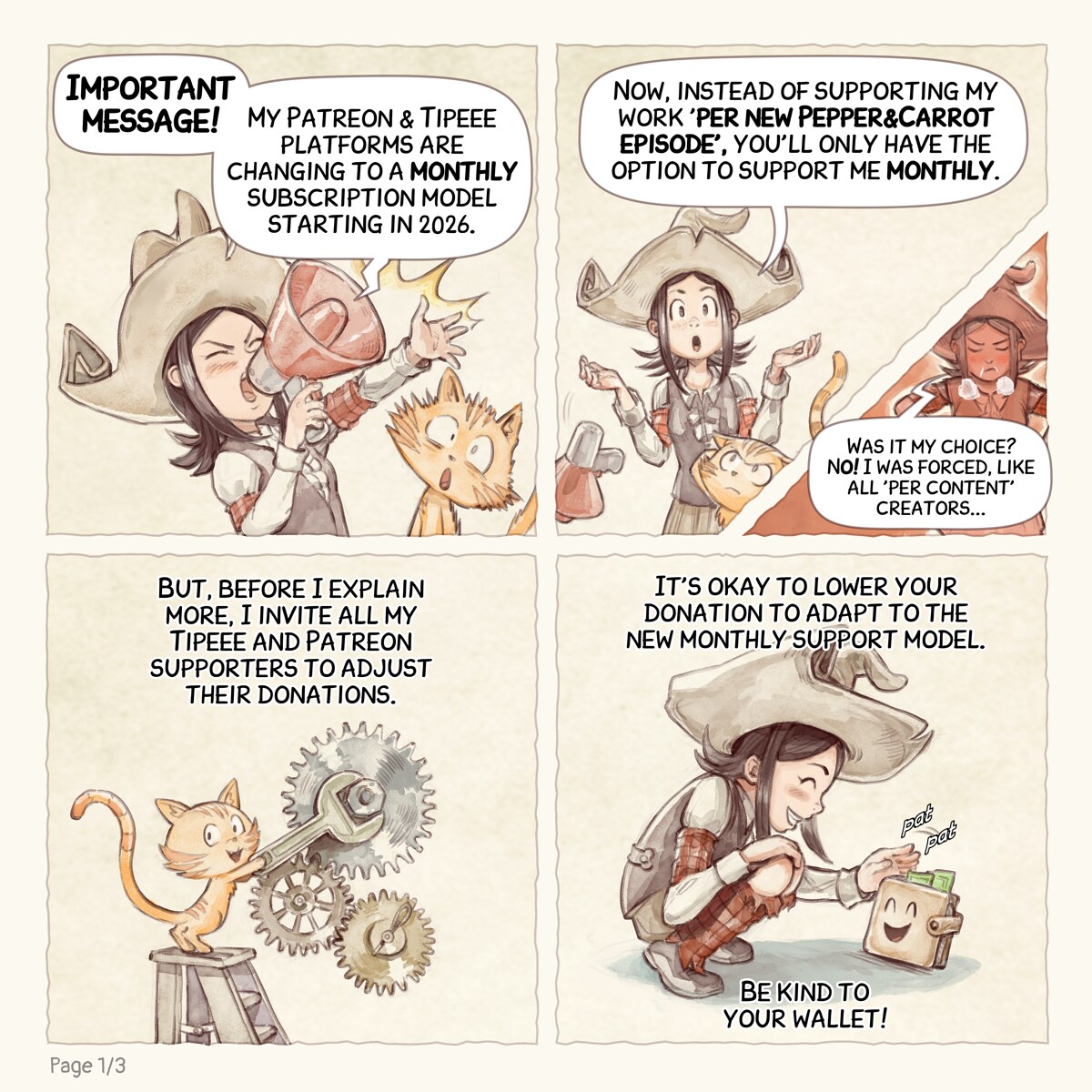 TL;DR: My Patreon and Tipeee accounts are switching to a monthly subscription model starting January 2026. Adjust your donation, be kind with your wallet! (Check out the short comic above.)