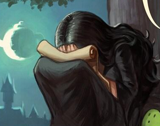 Panel 1. A young gothic sorceress sits in the grass at night, under the full moon. Her futuristic, Avian Intelligence (AI) parrot perches on a nearby branch.