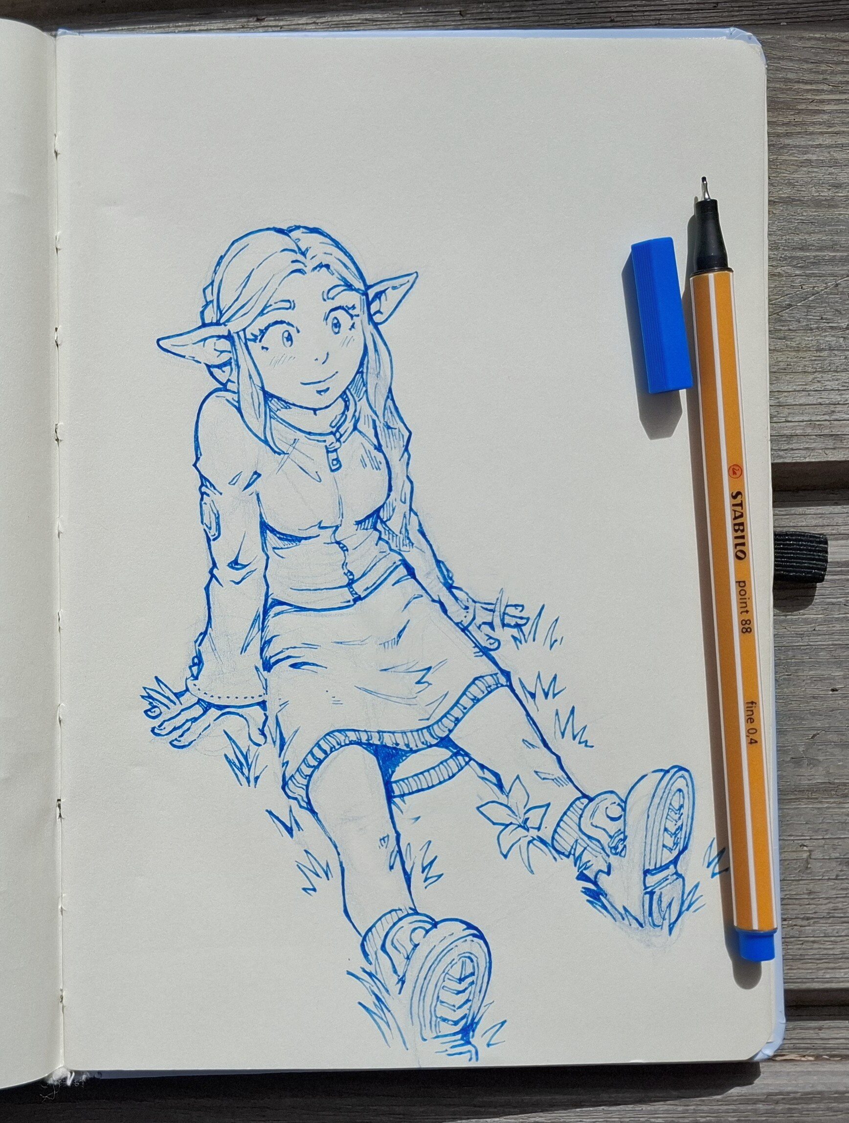 (Alt: Photo of a sketchbook page featuring a top-down view of Amall, a blond elf adult, but looking small like a child, sitting on grass. The photo has an ink pen lying on top (Stabilo Point 88 Fineliner) with blue ink, A5 notebook.)