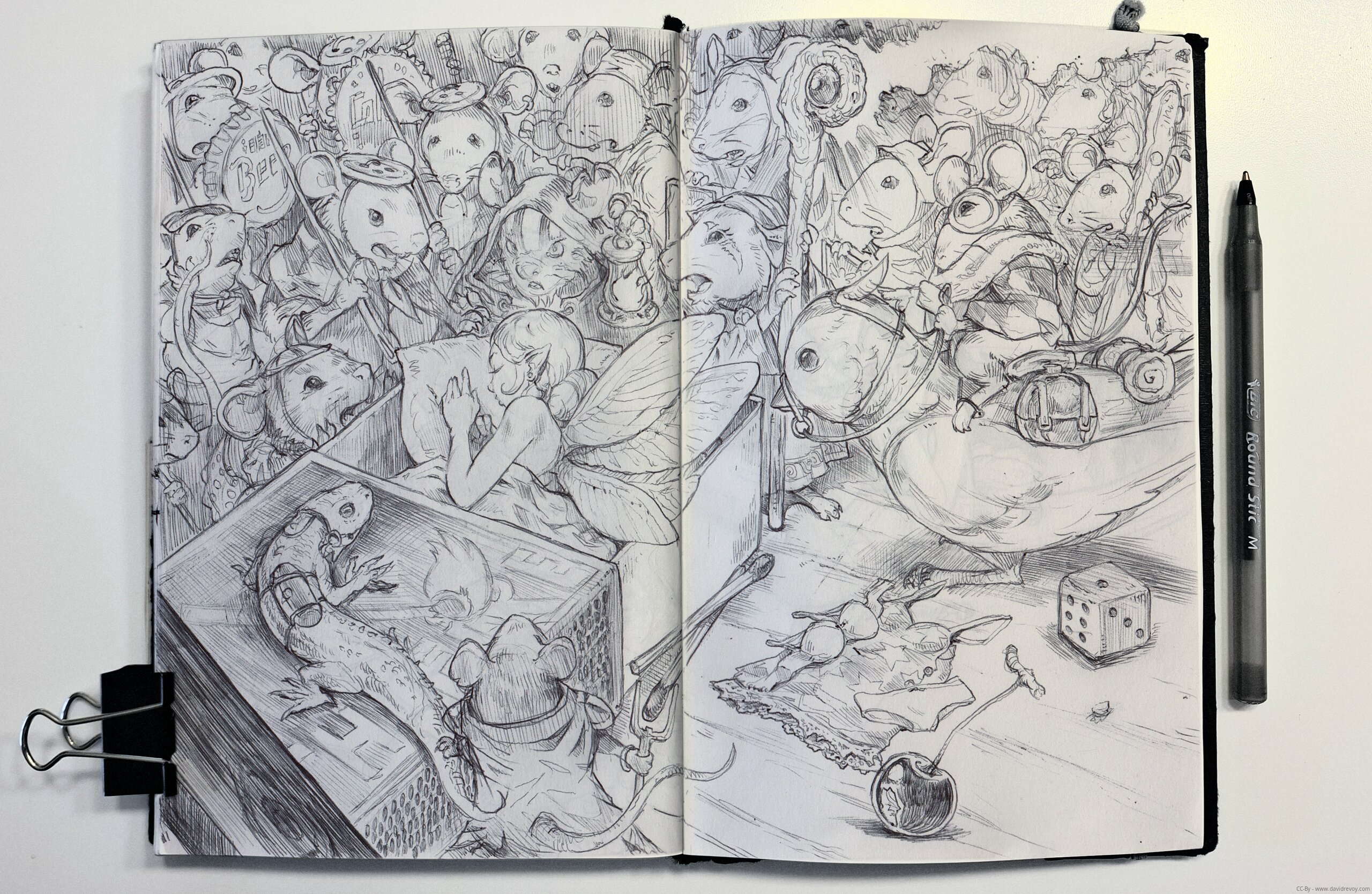 If you want to know more about the details of this improvisation, here is my reading of the final picture: the fairy came with her cherry dinner and curled up to sleep under a cozy blanket in a matchbox, her clothes scattered on the floor beside the box. But while she slept, an entire mouse kingdom and army discovered her. There's a shaman observing this unusual creature carefully, is it a bad omen? I liked the contrast between weird design for the mouse expression and the more classic 'sleeping beauty' design for the fairy. Many mice are uncertain how to react to this strange intruder in their territory, a female priest mouse (near the shaman) with her servants who seems to recognize something prophetic about this arrival (they hold tiny frame with the silhouette of a fairy on it) looks like alerting all of them to not wake up her. One soldier has a lizard familiar wearing a belt and carrying stuff, and another rides atop a small bird...