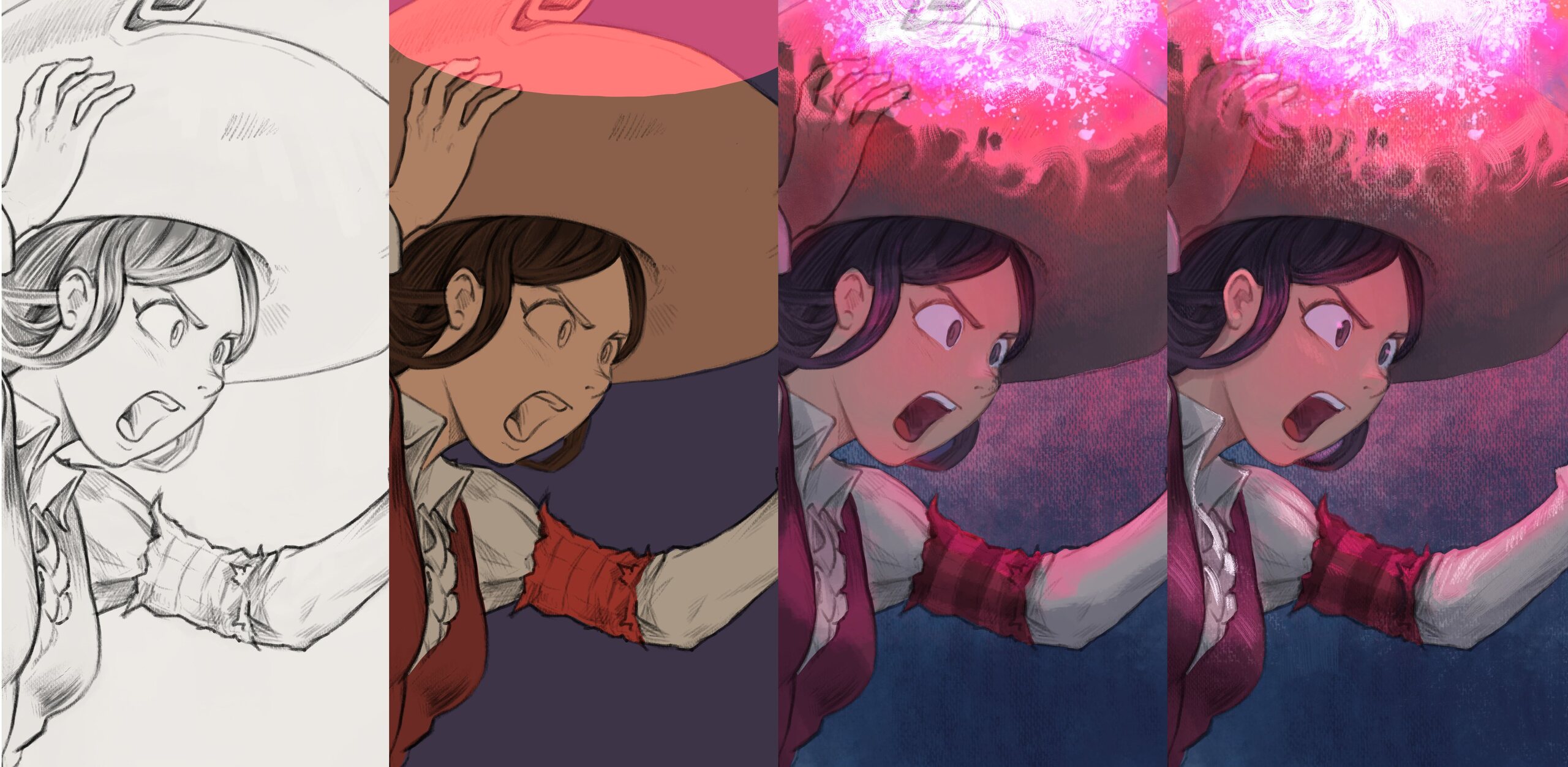 I wasn't really confident enough to just reuse my black and white speedpaintings and use a grayscale to color workflow on them. So my action plan was to consider this time the storyboard as an underlying sketch and redraw the artwork over it, flatten the colors, then shade the result with my brushes. In short here is a quick test illustration with Schichimi that shows the main steps for making my pages (the steps where I can pause the page and switch to the next one).