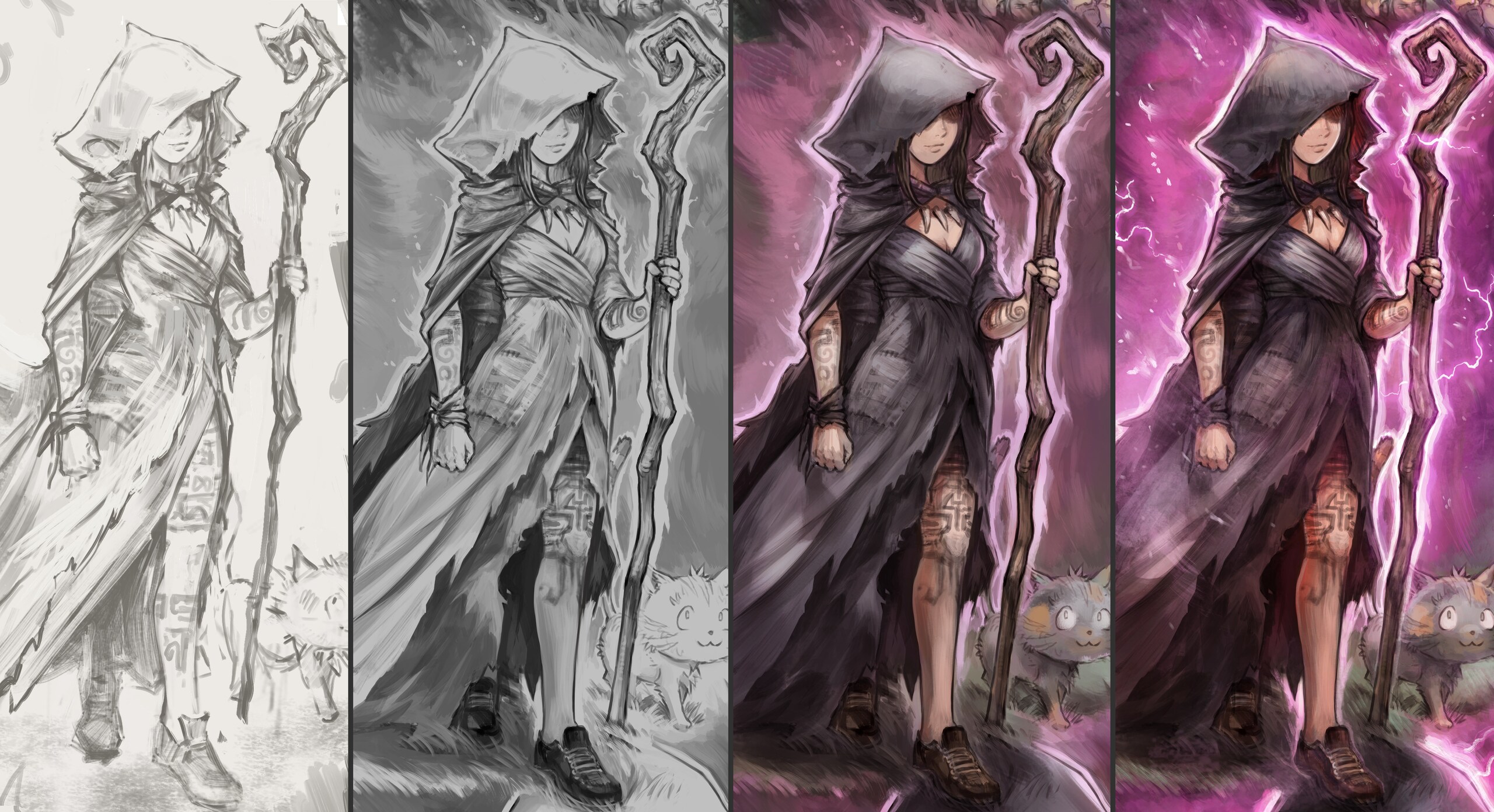 For this episode, I didn't create traditional line-art, but instead worked through a series of sketch iterations on a medium gray (#c0c0c0) background. Each iteration refined the previous one, with the final version being the cleanest. This process also allowed me to create rich grayscale values and shade certain areas.