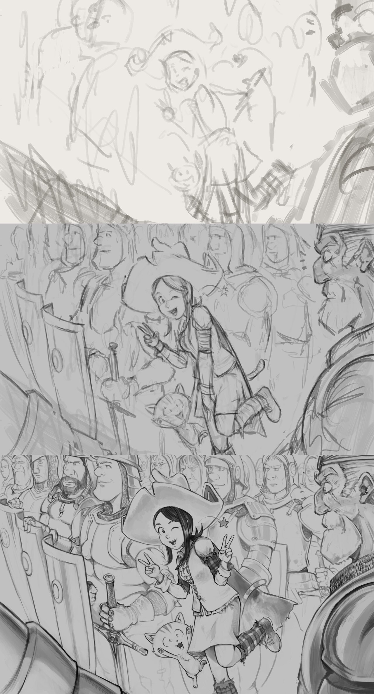 During the preproduction phase of this episode, I created numerous digital sketches. Many of these sketches perfectly captured the ideas I had in mind for certain panels, so I later copied them directly onto my pages.