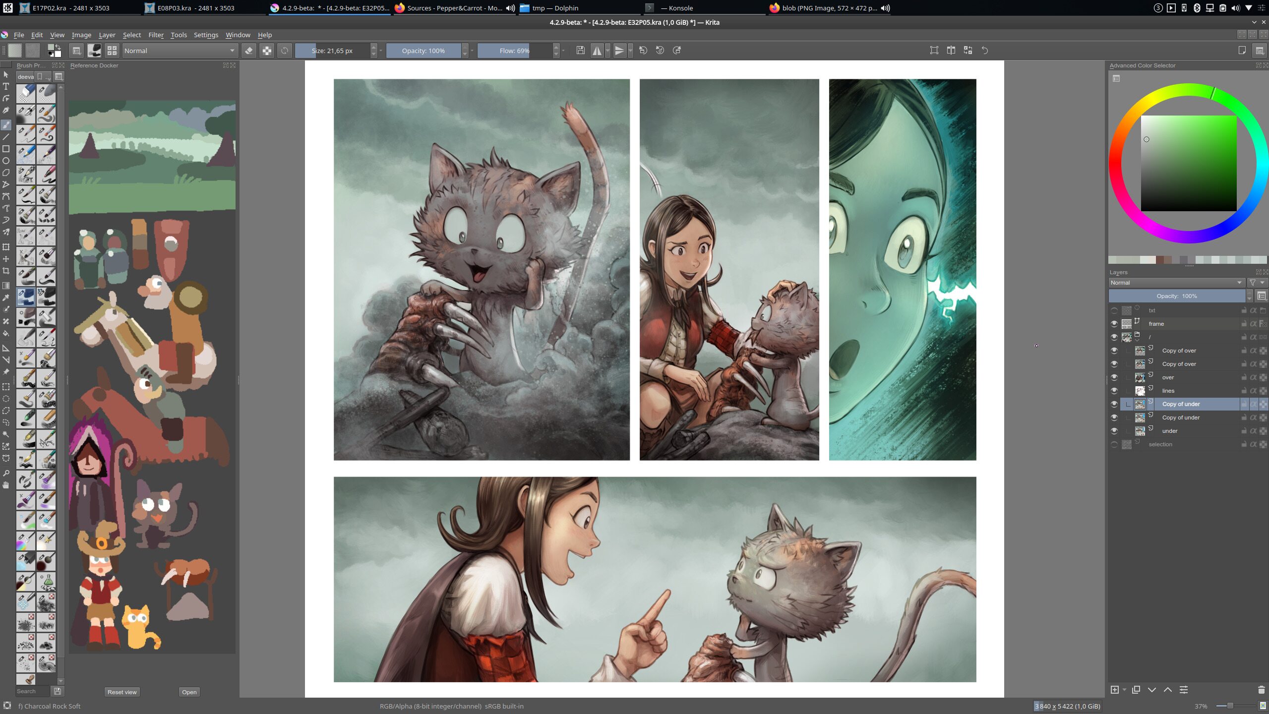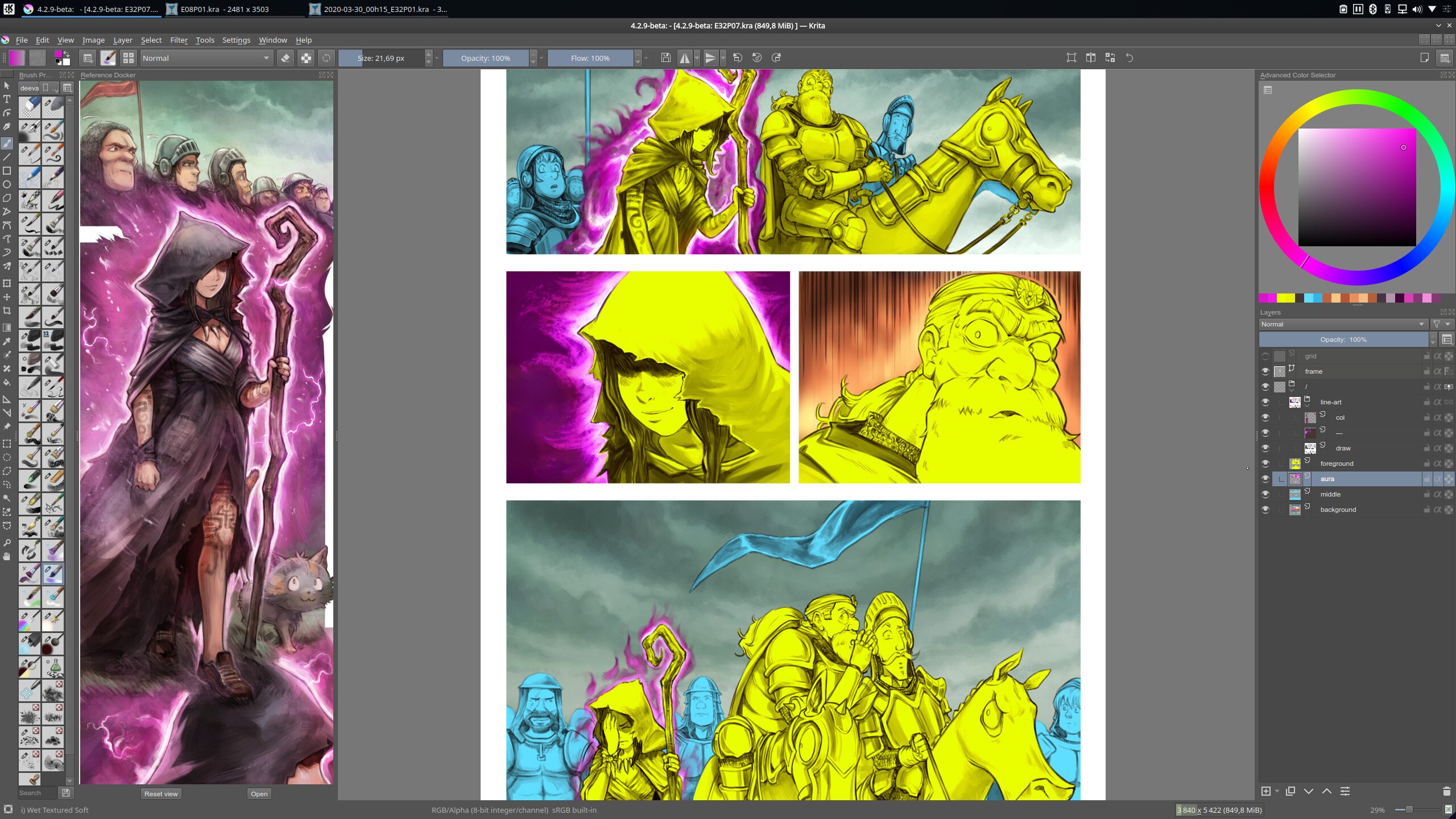 I made extensive use of the "reference docker" with a custom-made color palette to ensure consistent coloring for the main characters.